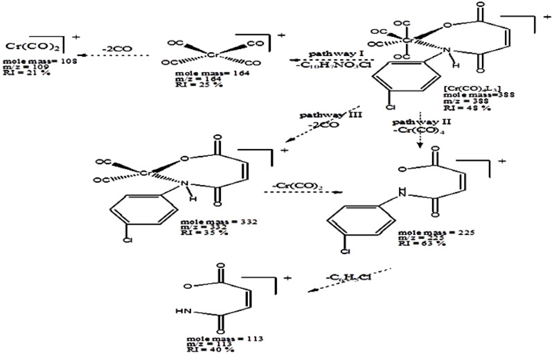 The mass fragmentation pathways of the principle fragment ions of [Cr(CO)